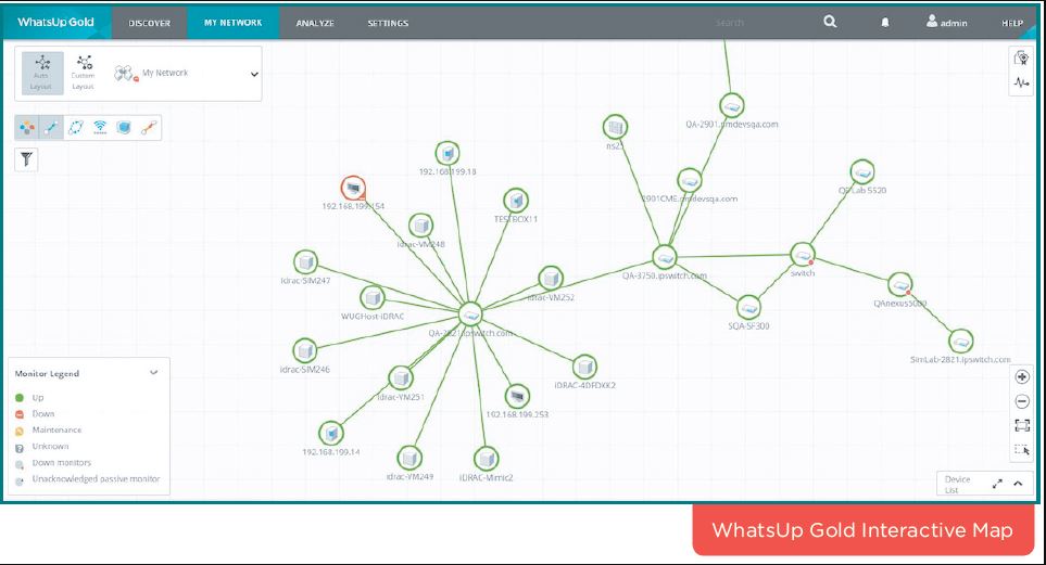 A WhatsUp Gold folyamatosan figyeli az infrastruktúra rendelkezésre állását és teljesítményét – az útválasztóktól, kapcsolóktól és tűzfalaktól kezdve a szervereken, tárolóeszközökön és alkalmazásokon át egészen a VMware virtuális gépekig. Röviden: a WhatsUp Gold képes minden olyan eszköz monitorozására, amely IP-címmel rendelkezik, és amely standard monitorozási protokollokon keresztül elérhető, beleértve az ICMP-t, az SNMP-t, a WMI-t és az SSH-t.